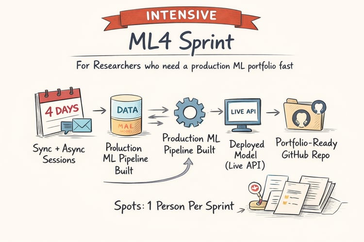 I've done Coursera. I've done Kaggle competitions. This was different. Four days, one project, fully deployed. Aleena knows production ML, not just theory. We built a predictive maintenance model on manufacturing data, trained it, logged experiments in MLflow, containerized it with Docker, and deployed it to Render with a live API endpoint. By Day 4, I had a public GitHub repo and a working model I could demo in interviews. I used this exact project in three interviews. Got offers from two. This is the portfolio piece I should've built a year ago."